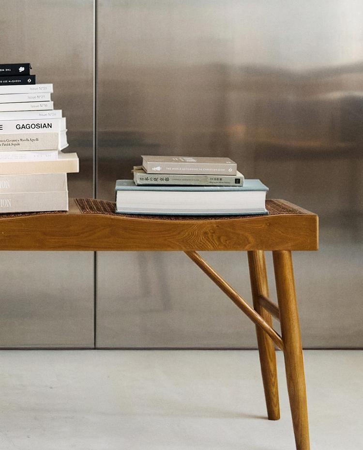 Long bench made of wood and rattan with three seats.