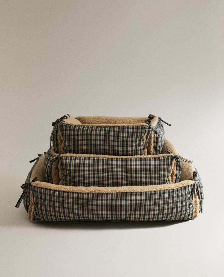 Cama para mascotas elaborada en tejido de borreguito con exterior de cuadro vichy y lazo decorativo en los laterales. Incluye cojín a juego para mayor confort.