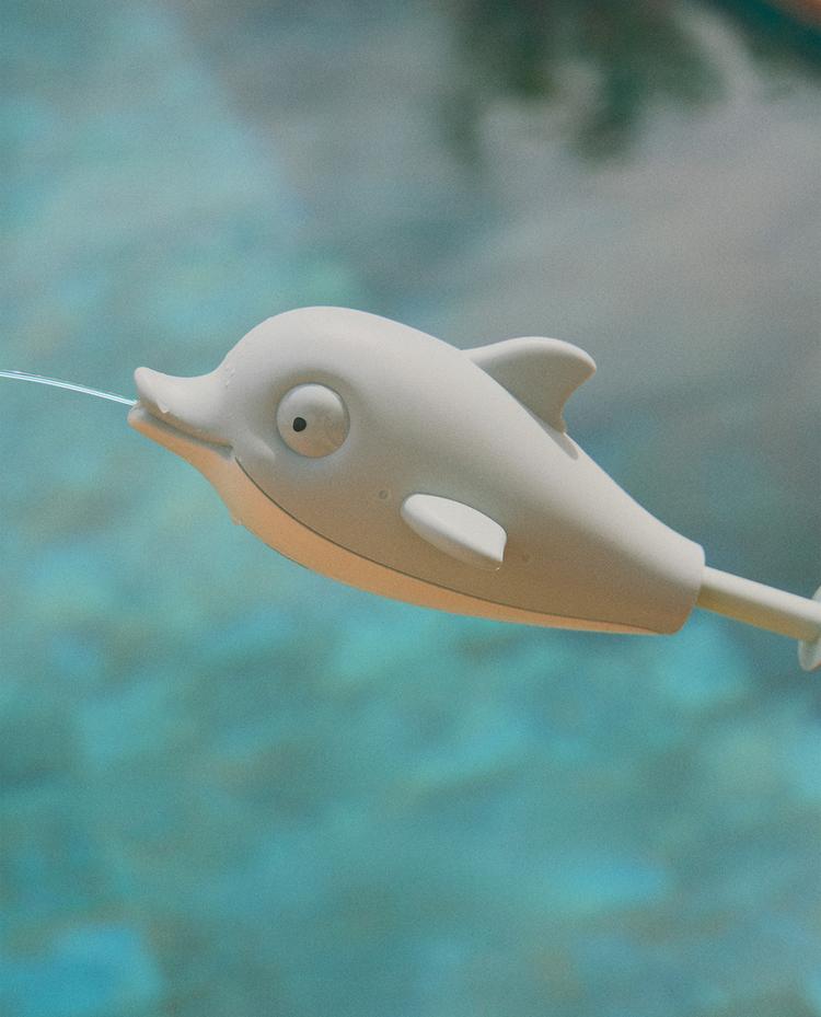 Pistola de agua de juguete para playa infantil, en forma de delfín. Se llena al echar hacia atrás la cola del delfín. Al impulsarla de nuevo hacia adentro, se genera presión para que así pueda rociar agua.