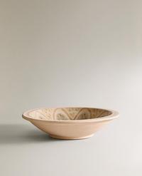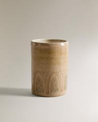 Distributeur de savon de bain en terre cuite avec finition mate dans les tons beige et crème, corps cylindrique à parois droites et surface aux veines irrégulières, équipé d'une pompe doseuse finition argentée.