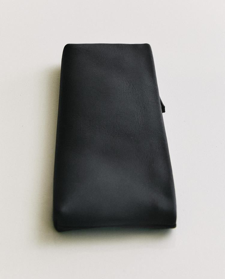 Estojo porta-objetos elaborado em pele com forma plana retangular e fecho de correr.