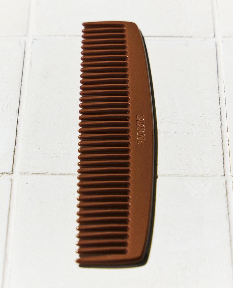 Pente de cabelo fabricado em acetato com acabamento translúcido, design alongado de linhas retas com dentes finos e uniformes e superfície polida de toque suave.