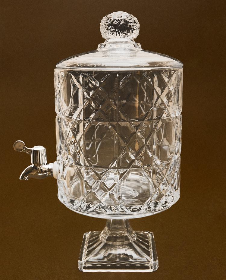 موزع مشروبات زجاج بصنبور ستيل وغطاء. تصميم ألماسي بارز.