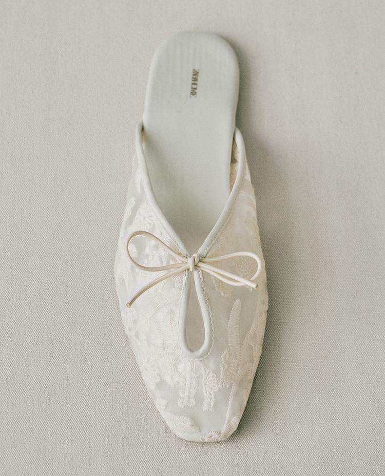 Flat mule slippers with mesh body. Embroidered floral detail and bow on the instep. Satin insole.