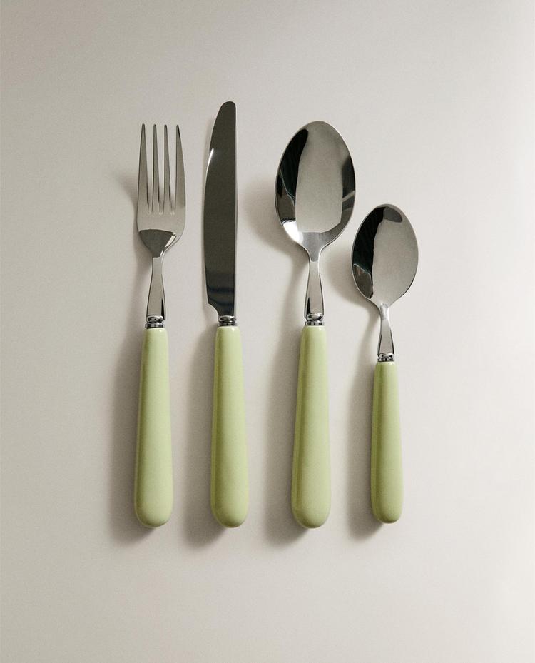 Set ngrënieje inoks me shkëlqim që përfshin një pirun, thikë, lugë supe dhe lugë ëmbëlsirash. Doreza qeramike e drejtpërdrejtë dhe sipërfaqe e lëmuar, e cila shton kontrast me pjesën metalike.