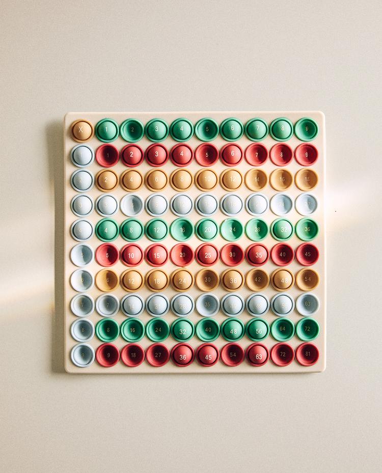 Lodër drejtkëndore për fëmijë me butona shumëngjyrëshe, e dizajnuar për të ndihmuar në mësimin e shumëzimit.