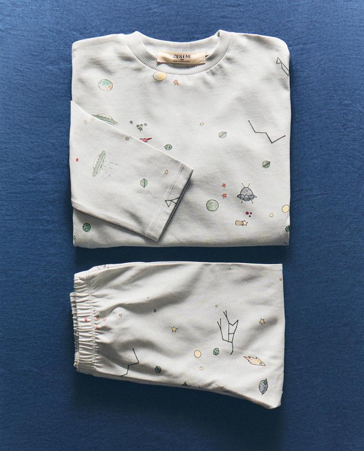 Set pizhamesh pambuk për fëmijë, përbërë nga një bluzë me mëngë të gjata me jakë rrethore dhe pantallona. Stampime me motive hapësinore dhe detaje me shkëlqim.