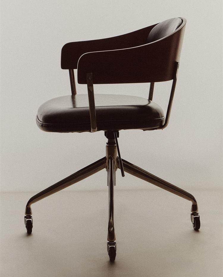 Bureaustoel met een zitting en rugleuning gestoffeerd in donkerbruin leer, en een metalen onderstel. Draaibaar design met wielen en verstelbare hoogte voor meer comfort.