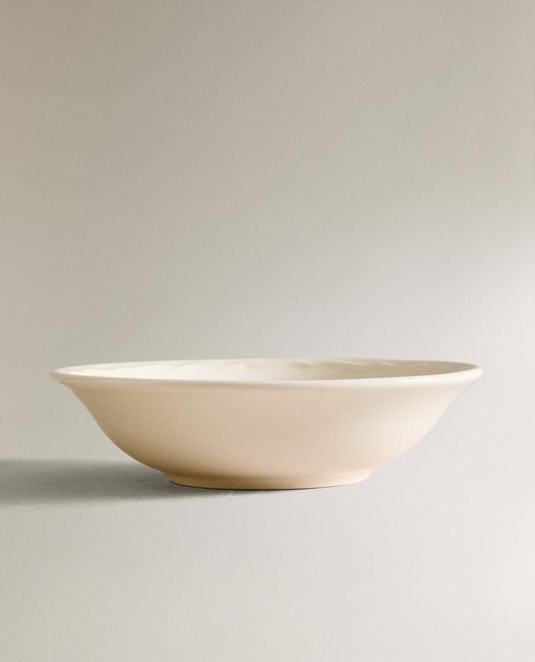Ecru earthenware soup plate. Plain with decorative raised design on the edge.