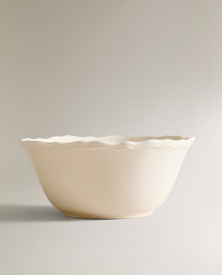 Ecru earthenware salad bowl. Plain with decorative raised design on the edge.